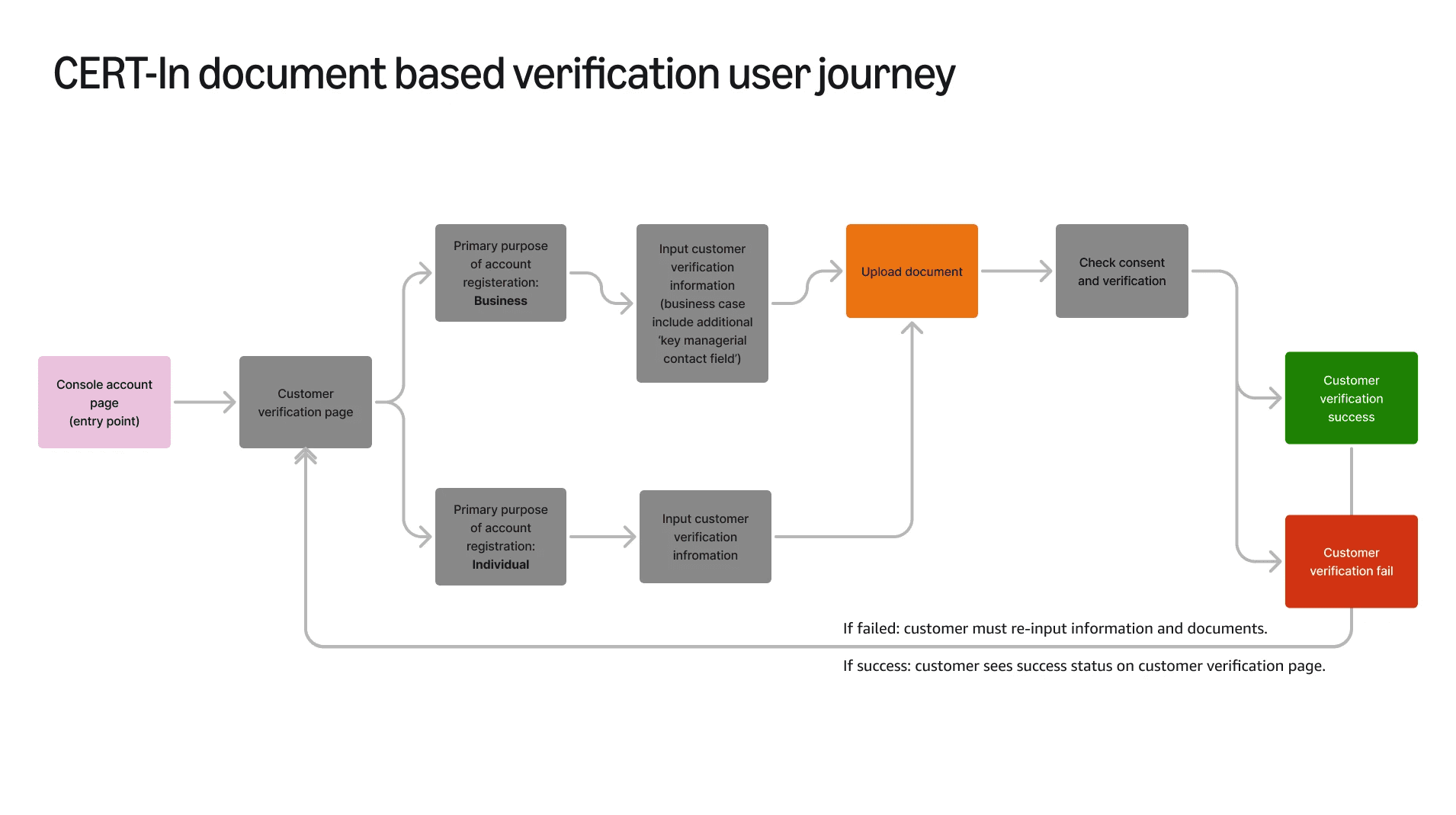 The verification flow was strategically restructured with a logical reordering of form fields based on established UX input patterns, creating two distinct but cohesive journeys for new and existing customers. This approach not only satisfied CERT-In compliance requirements but also maintained AWS's commitment to user-centric design. The system's architecture supports multiple document types for both B2B and B2C customers, with built-in security measures for document processing and storage, all while preserving AWS's onboarding experience.